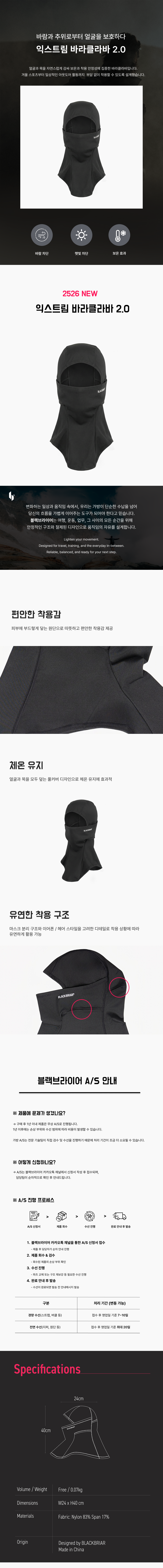 부드럽고 신축성 있는 소재로 얼굴과 목을 감싸주어 다양한 아웃도어 활동에서 편안하게 착용할 수 있는 바라클라바입니다.